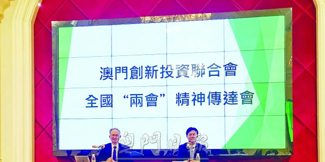澳門創新投資聯合會於四月二十八日晚上六時半假利澳酒店三樓宴會廳舉辦十四屆全國人大一次會議、全國政協十四屆一次會議精神傳達報告會。邀請澳區全國人大代表黃顯輝及全國政協澳區委員葉兆佳擔任主講嘉賓,向創投聯會會員傳達全國“兩會”精神。嘉賓介紹本屆“兩會”的會議精神、內容概述、國家今年的工作報告與各項重點工作等。該會副會長廖啟承、崔天佑,理事長吳偉恩、監事長蘇永勝以及逾四十名會員出席。
